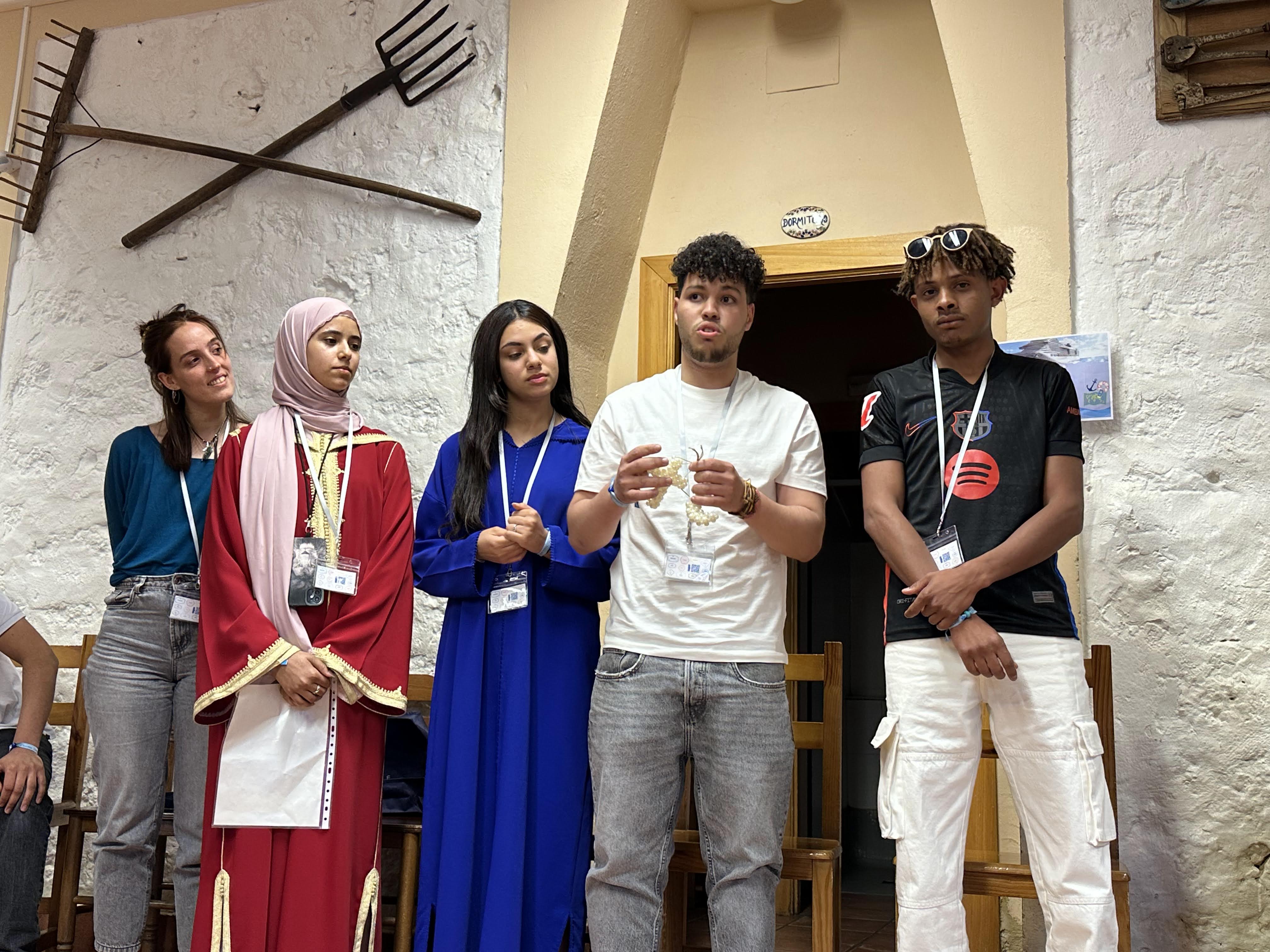 Por la noche llegó el esperado Festival de las Culturas: un espacio para celebrar nuestras identidades y diversidad desde el respeto, la alegría y el encuentro. Algunos hitos de la noche fueron, por ejemplo, el espectacular show de Laura, de Red Íncola, quien nos hizo cantar y aplaudir al ritmo de su ukelele. Akram, de Centro Lasa, se animó a compartir con el grupo una de sus grandes pasiones: tocar flamenco con su guitarra. Por su parte, Malak, Kamal, Zineb y Mohamed, de Fundación Ellacuría, compartieron prendas tradicionales marroquíes como el caftán y la gandoura. Malak presentó también artículos de maquillaje de la tradición bereber, como por ejemplo el aker fassi o el kohl. Además, Daniela nos enseñó los pasos básicos de la cumbia colombiana, que animó a muchos a ponerse de pie, y Thais y Daniel nos regalaron una coreografía al ritmo de un festejo afroperuano. Cerramos la noche luego de muchas risas, música, bailes, tradiciones, identidad y alegrías compartidas.