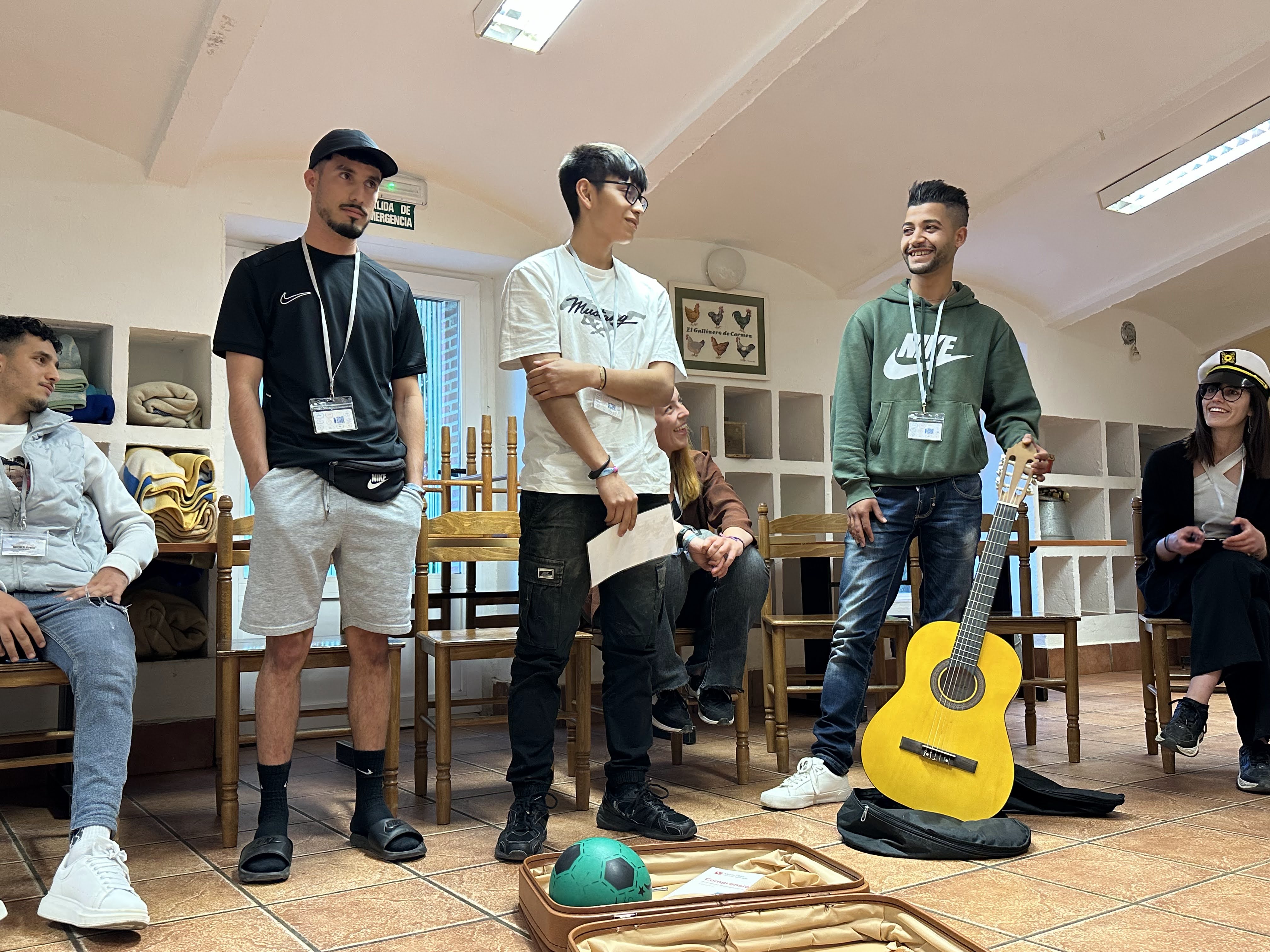 A medida que fueron llegando todos y todas, dimos inicio al encuentro con una dinámica para romper el hielo y comenzar a conocernos poco a poco. Cada entidad se presentó a través de su “maletas de participación”, que estaba cargada de objetos simbólicos que representaban quiénes son y cómo participan en las entidades y sus entornos. Desde un cubo de Rubik hasta instrumentos musicales, fotografías, banderas… Cada objeto traía consigo una historia, una emoción o un mensaje. Muchos de los/as jóvenes, cuando se presentaron, coincidieron al mencionar que no hay diferencias entre los unos y las otras, que habitamos el mismo mundo. El grupo de Red Íncola, por ejemplo, presentó una figura de la tierra y explicó: “Todos venimos de un mismo lugar, el mundo nos pertenece a todos por igual. ¿Por qué fronteras? Sin fronteras, somos todos iguales”.